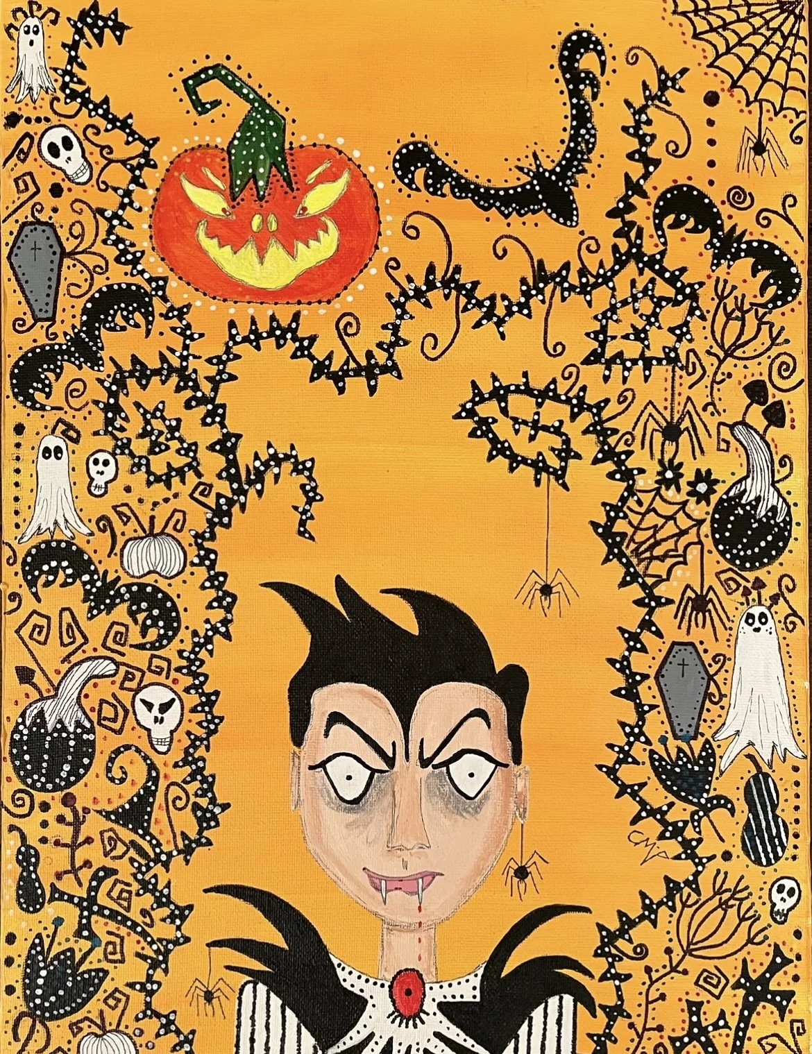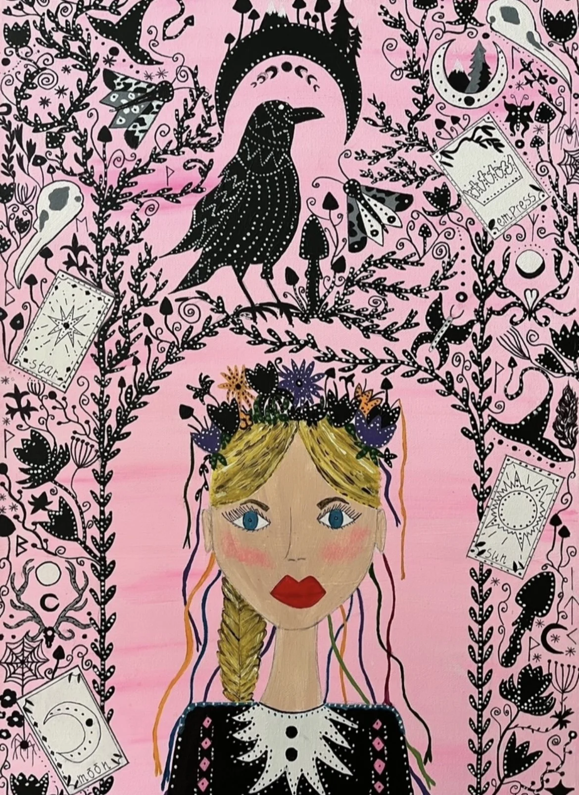 The inspiration for Catherine’s artwork is drawn from many sources including from her fascination of birds and her favourite authors. She finds the poems of Edgar Allan Poe really ignites her creativity and ideas. She has a fascination with Gothic fiction and ghost stories as well as a partiality towards skulls and skeletons! Catherine also finds influence in folklore and fairies and feels that these are elements she often includes in her artwork as well as her writing. Her love of fantasy, the strange and sometimes the macabre are the driving forces behind her creativity. Most recently, Catherine has been inspired and influenced by Ukrainian Folk Art and loves to incorporate these design elements into her paintings- with a Gothic twist.